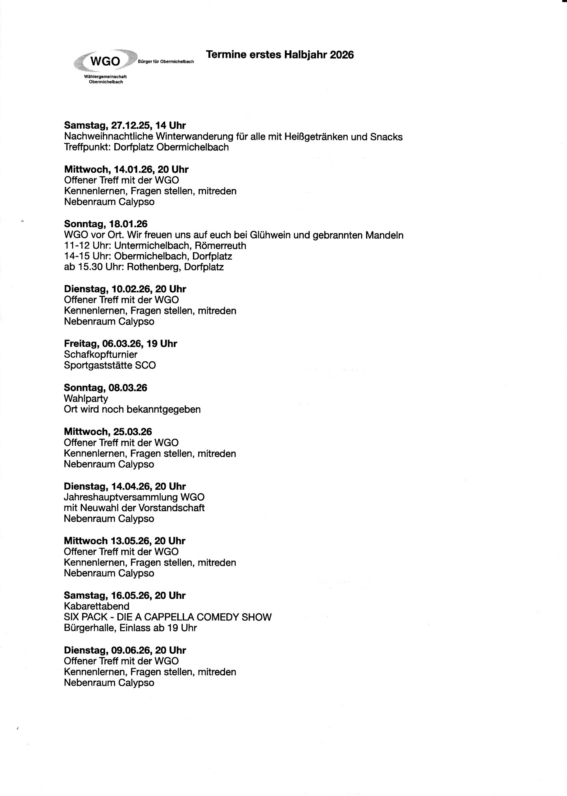 - Di. 14.04.2026 – Jahreshauptversammlung WGO mit Neuwahl, 20:00 Uhr – Kalypso (Nebenraum)