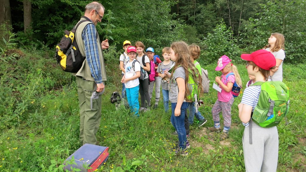 Am Freitag, den 18. August erkundeten 14 Kinder mit dem Förster Raymund Filmer und seinem Hund Jogi den Pfarrwald bei Obermichelbach. Am Weiher am Ende der Burgstallstraße ging`s los.