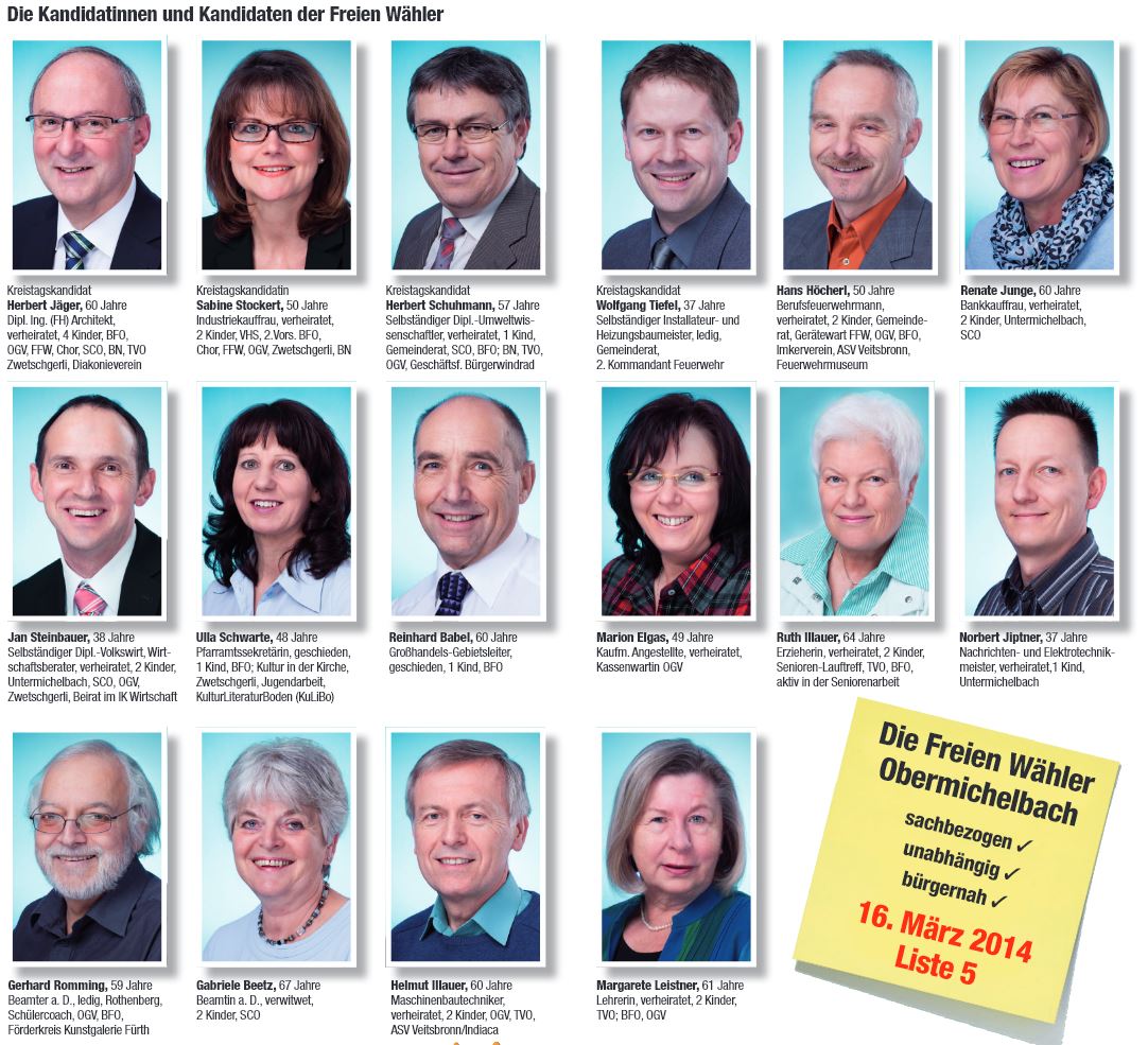 Die Freien Wähler Obermichelbach treten zur Kommunalwahl 2014 mit einer Mischung aus neuen und bekannten Kandidatinnen und Kandidaten an. An der Spitze der Liste steht der amtierende Bürgermeister Herbert Jäger, der zugleich einstimmig als Bürgermeisterkandidat nominiert wurde.