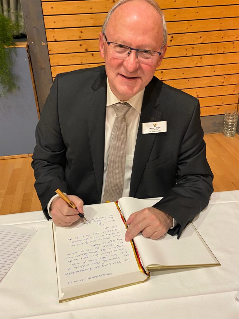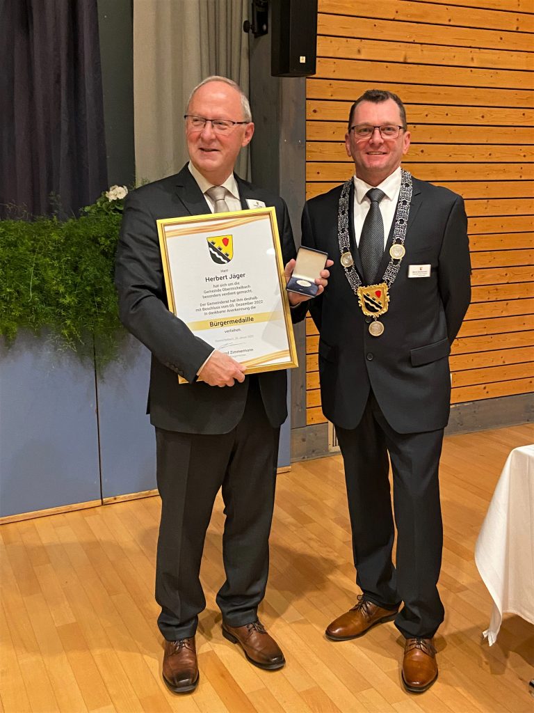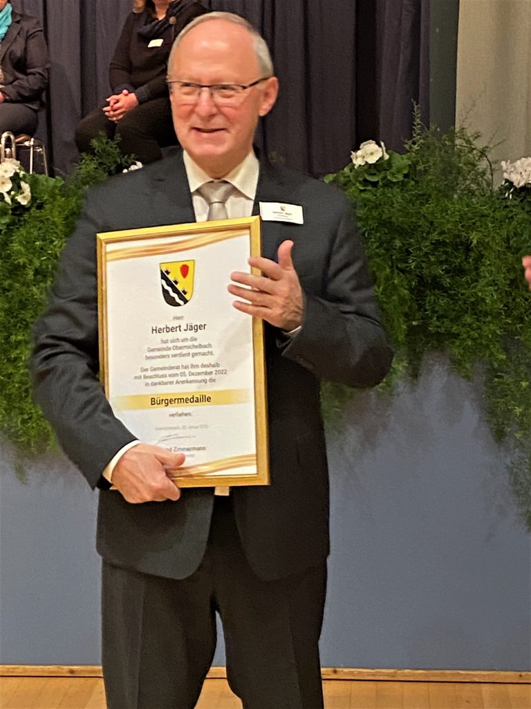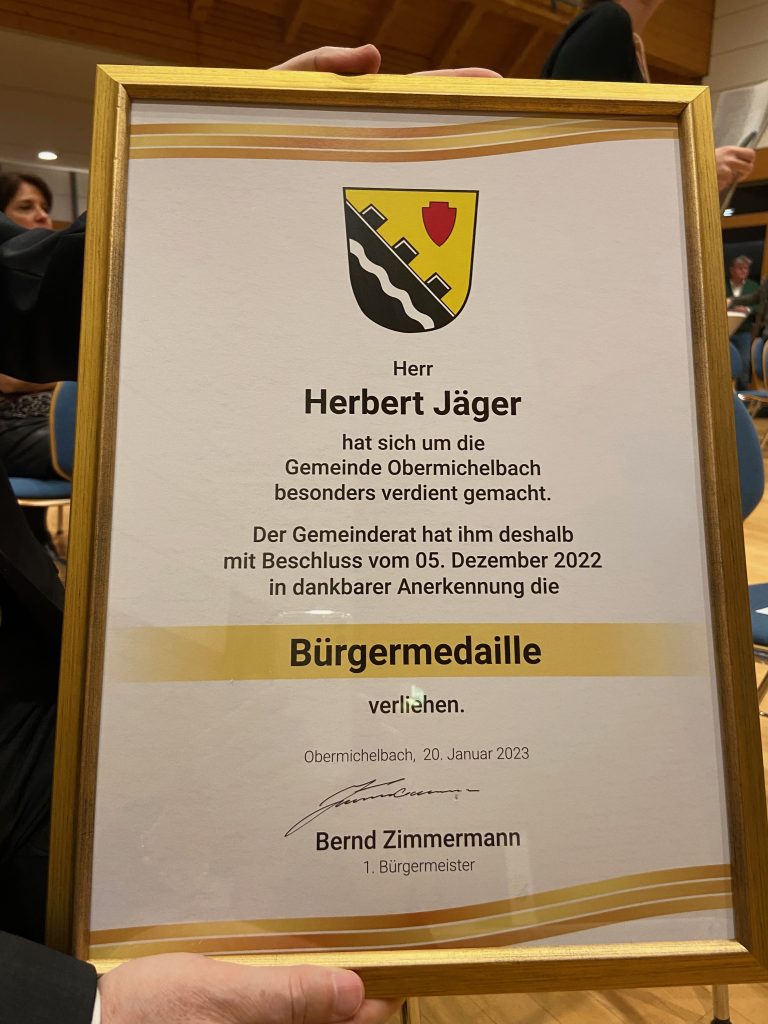 „Herr Herbert Jäger hat sich um die Gemeinde Obermichelbach besonders verdient gemacht. Der Gemeinderat hat ihm deshalb mit Beschluss vom 5. Dezember 2022 in dankbarer Anerkennung die Bürgermedaille verliehen“.