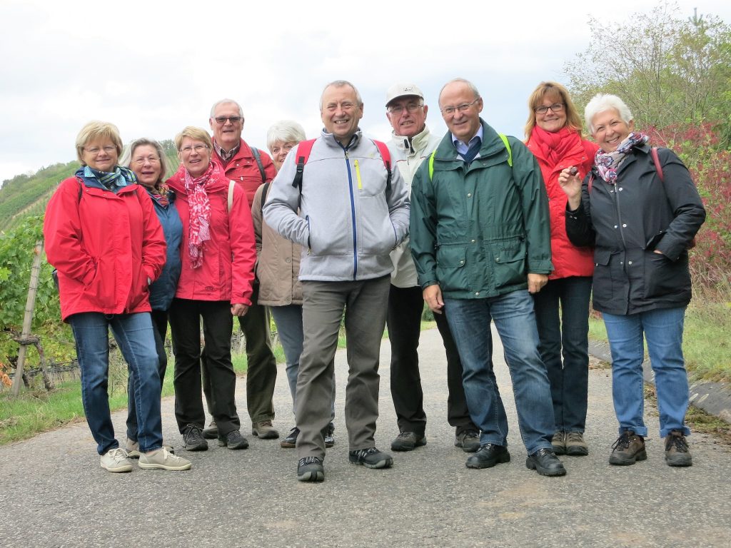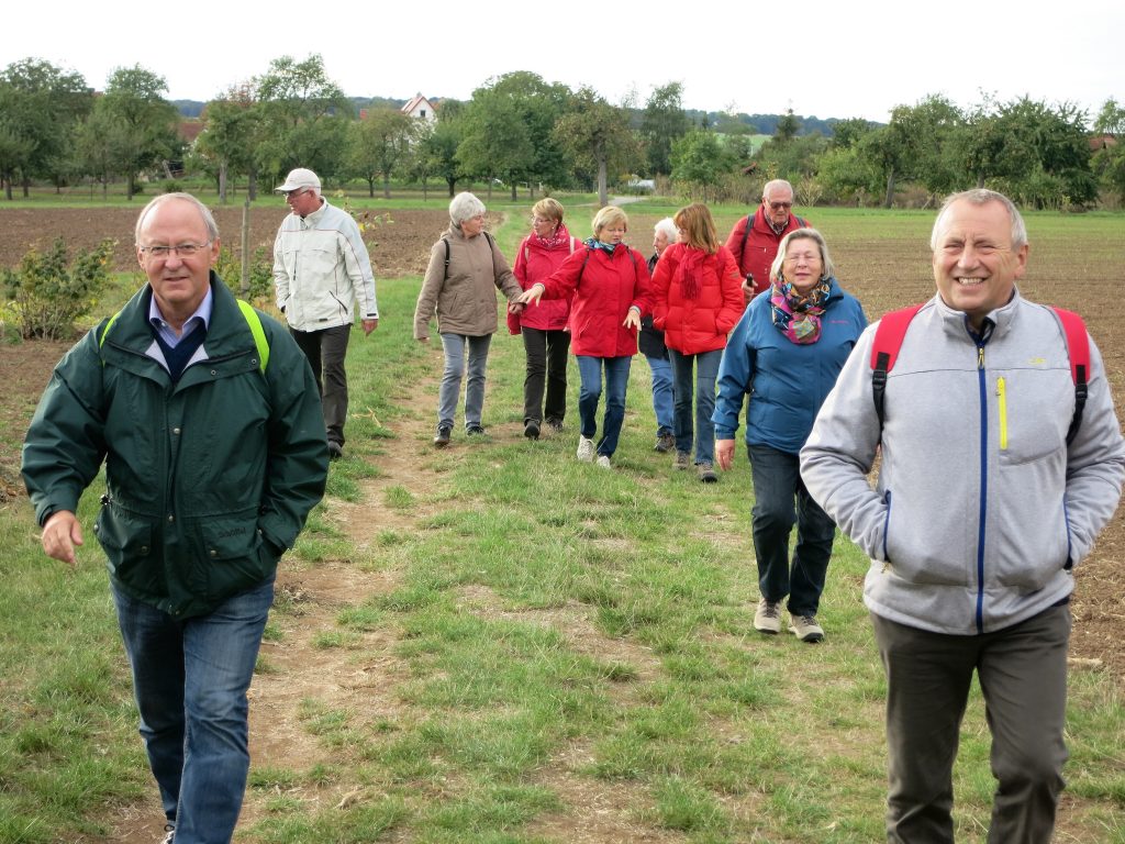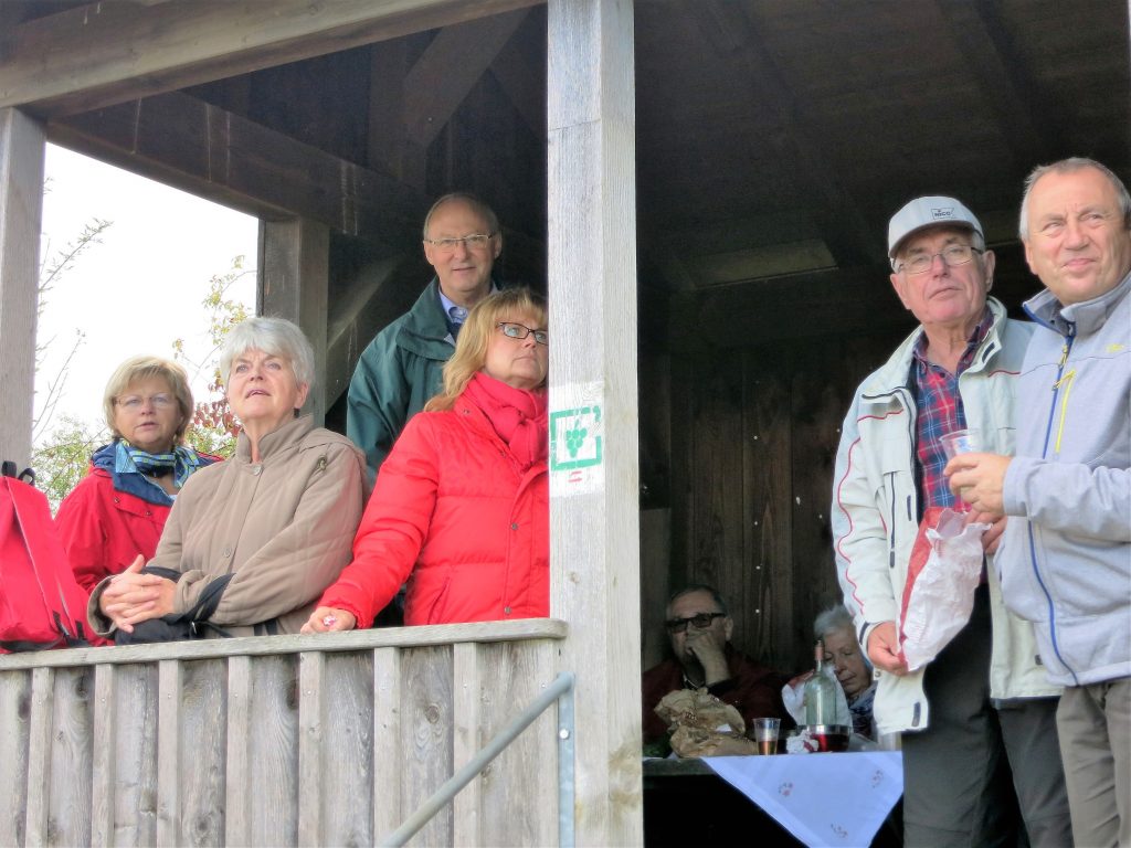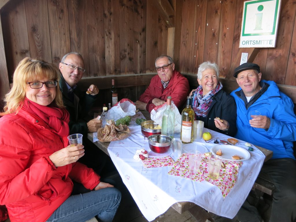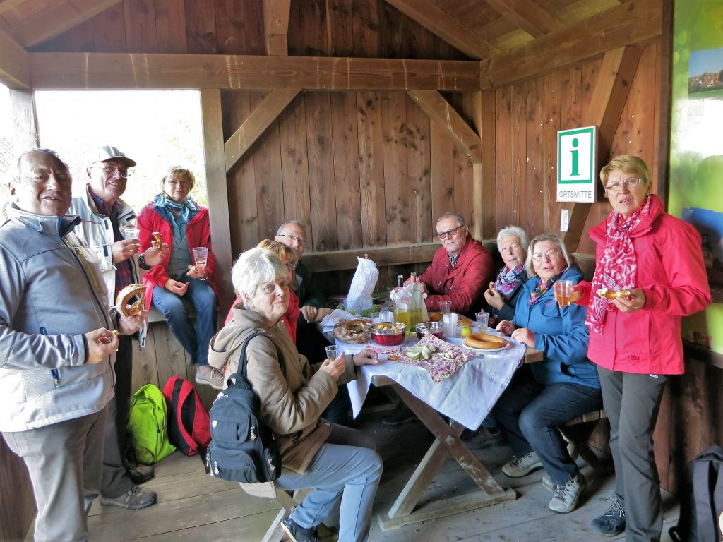 Gut gelaunt wanderten wir anschließend auf dem Weinparadiesweg durch die Weinberge am Fuße des Hüttenheimer Tannenberges. In einer Wanderhütte packten wir die Schätze aus unseren Rücksäcken aus: Hüttenheimer Wein, Brezen, Käsewürfel, Salami, und einen ganzen Ring Fleischwurst. Diese Winzerbrotzeit schmeckte allen vorzüglich und wir genossen dabei den herrlichen Panoramablick über die herbstlichen Weinberge des Weinparadieses. Kein „Bröggala“ unserer Vesper blieb übrig. Der traditionelle Trinkspruch zur Schnapsrunde passte bei dem einen oder anderen perfekt: “Immer wenn ich geh und steh, tun mir meine Knochen weh. Wenn ich jedoch sitz und sauf, hören die Schmerzen auf“.