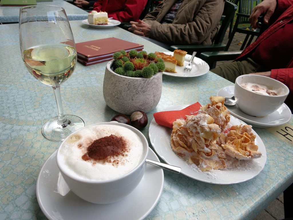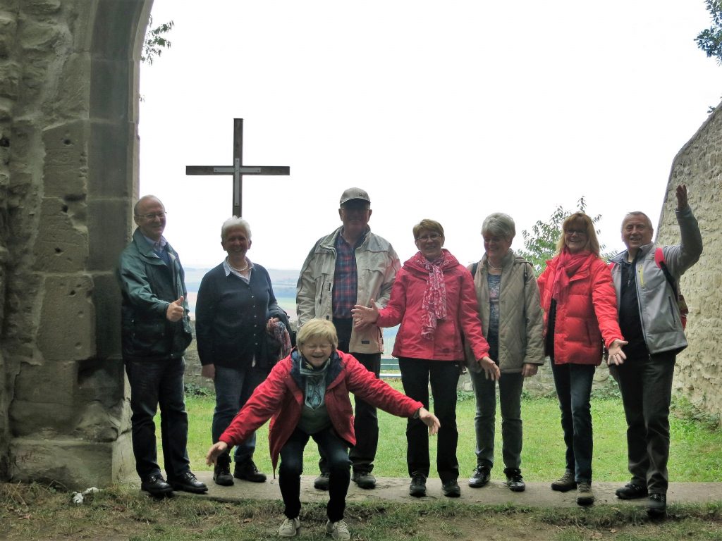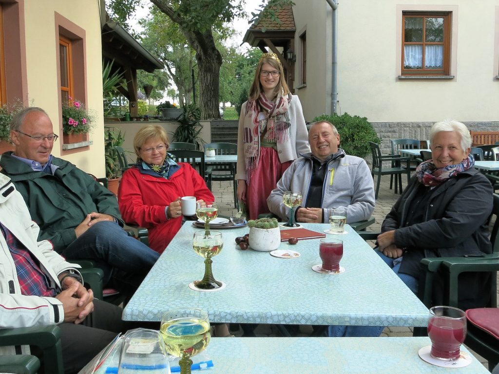 Mit vollen Bäuchen und leeren Rucksäcken ging´s dann vorbei an der Weinparadiesscheune und mit einem kleinen Abstecher über den Winzersteig hinauf zur Ruine Kunigundenkapelle. Der kurze, anfangs etwas steile Aufstieg wurde mit einer grandiosen Aussicht belohnt. Entspannt ging es durch die Weinberge hinunter nach Bullenheim in eine gemütliche Heckenwirtschaft. Bei Kaffee und Kuchen und dem ein oder anderen Gläschen Bacchus oder Silvaner überraschte uns die Bullenheimer Weinprinzessin Lena mit ihrem Besuch und erfreute uns mit ihrem Liebreiz.