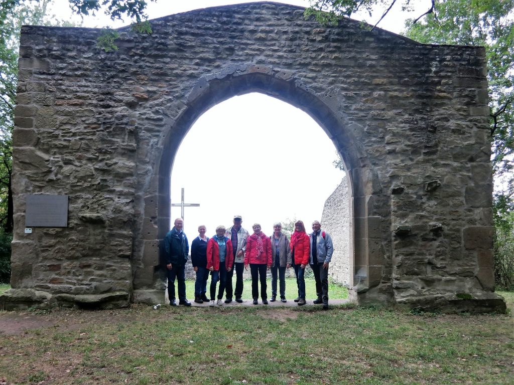 Mit dem Regionalexpress fuhren wir von Siegelsdorf nach Iphofen. Dort stiegen wir um in den Kirchenburg-Express nach Hüttenheim. Bei einem Dorfspaziergang besichtigten wir eine der größten und besterhaltenen Kirchenburgen Frankens. Richtig feierlich wurde es, als wir stimmgewaltig in der Kirche den Choral „Großer Gott wir loben dich“ anstimmten.