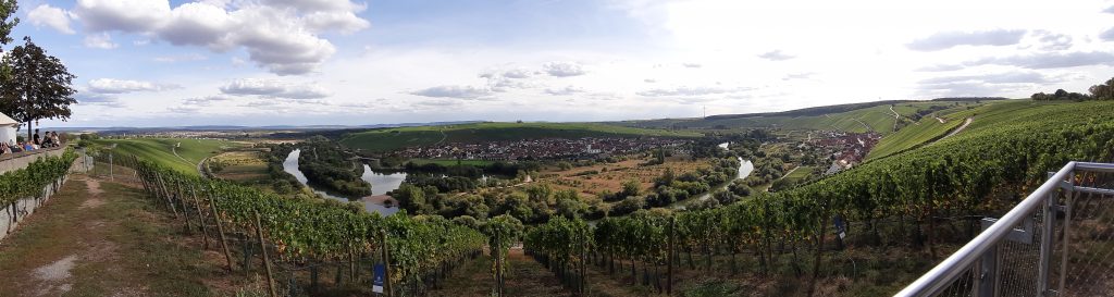 Gestärkt wanderten wir auf meist geteerten Spazierwegen zum Kaffeetrinken auf die Vogelsburg, von deren Terrasse sich der wohl spektakulärste Ausblick über die Weininsel und die Mainschleife bietet.