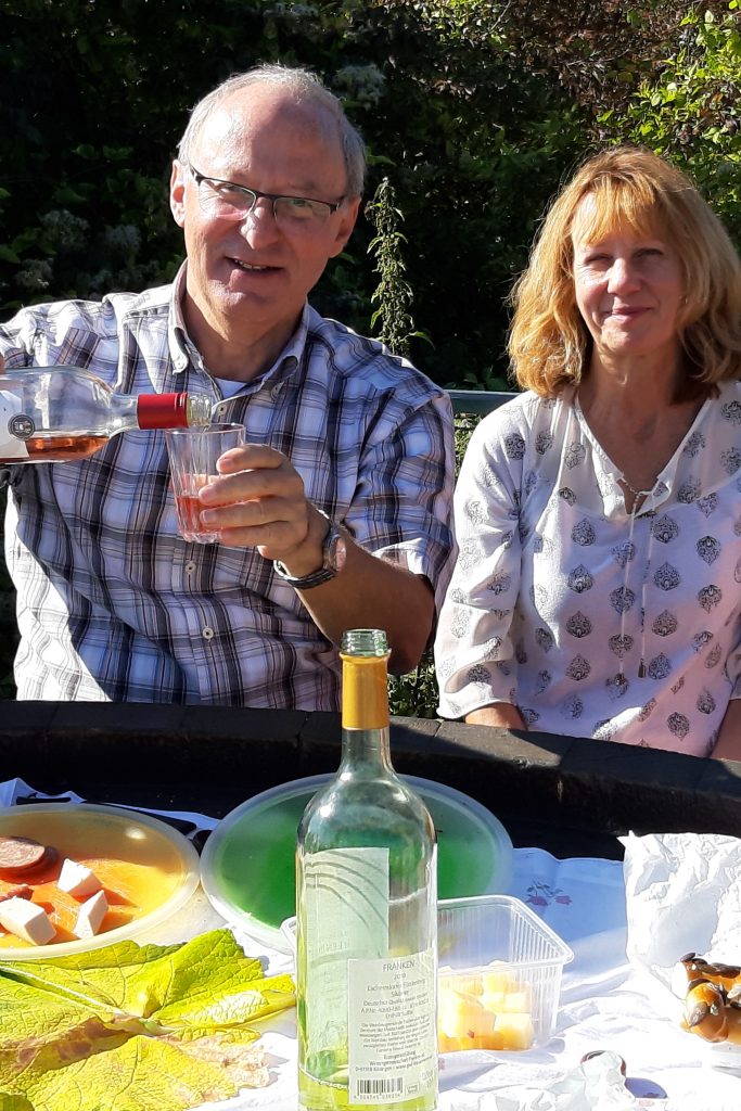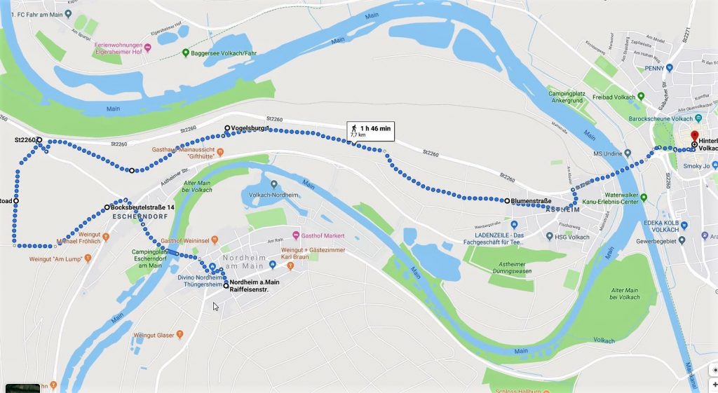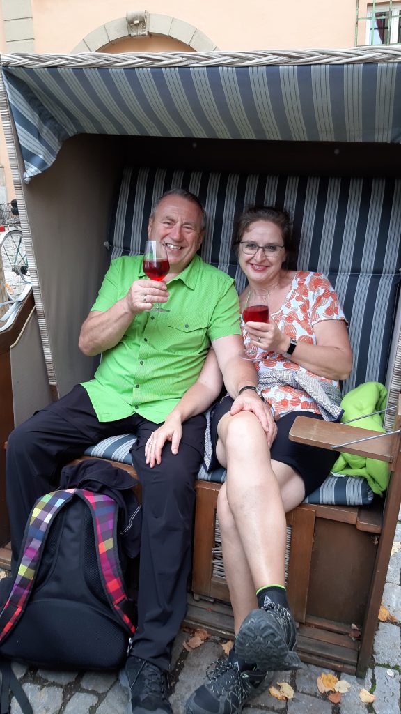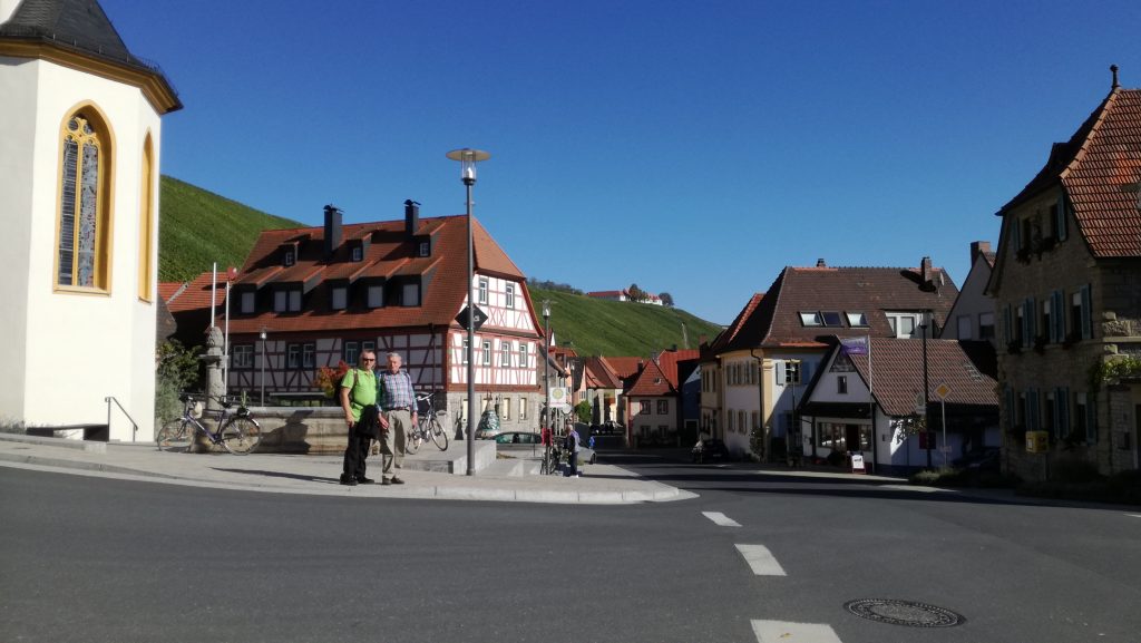 Durch den Wingert ging es dann ganz entspannt auf dem Panoramaweg über Astheim nach Volkach, dem Ziel unserer Traumrunde. Nach einem Spaziergang durch das Städtchen und einem Gläschen Wein auf dem malerischen Marktplatz vor dem Rathaus, ließen wir im Hinterhöfle, einem romantischen Weingärtla mit mediterranem Flair, den Tag bei einem typischen Winzergericht und Frankenwein ausklingen.