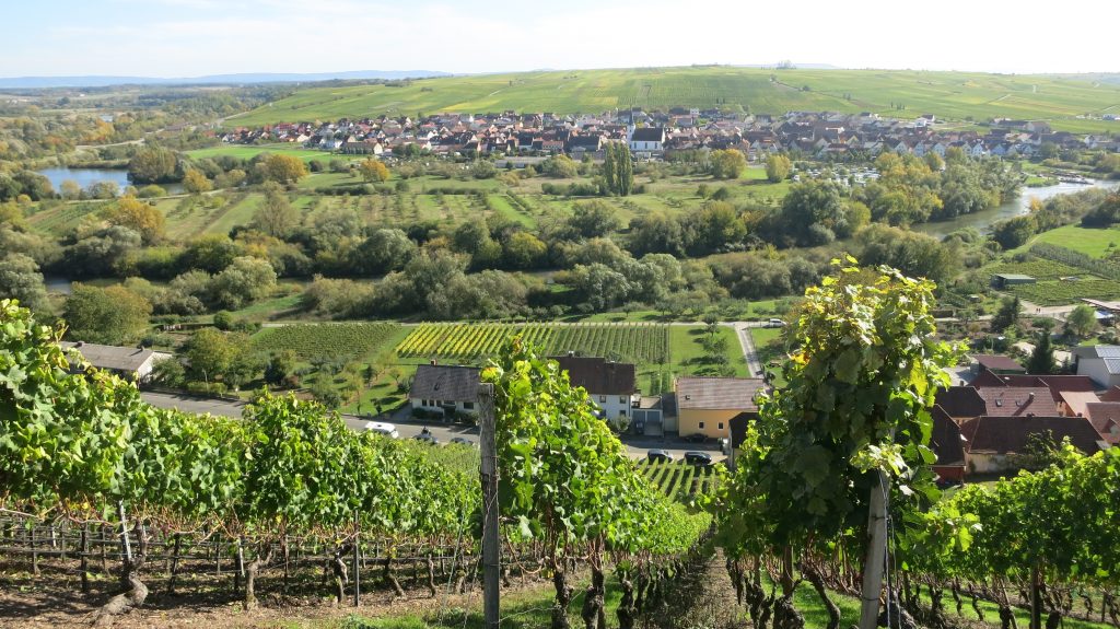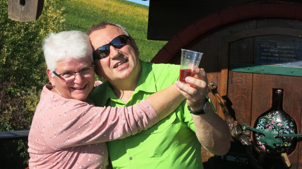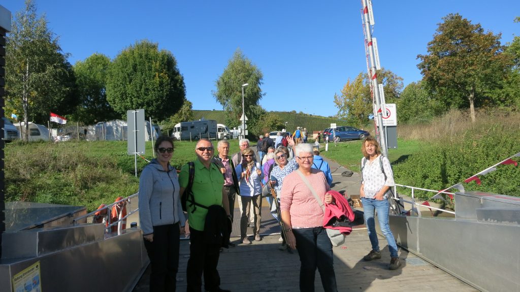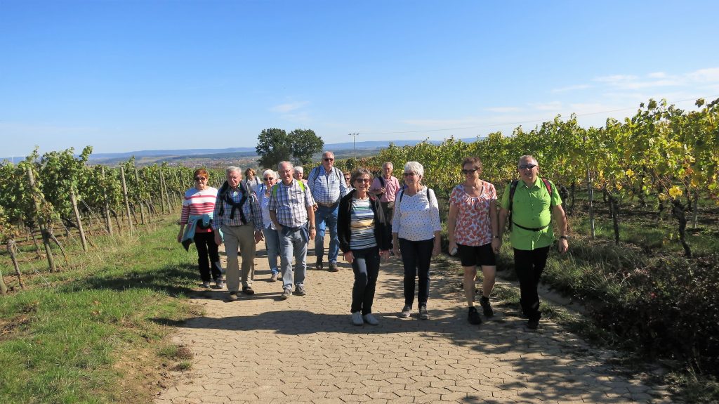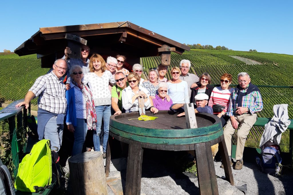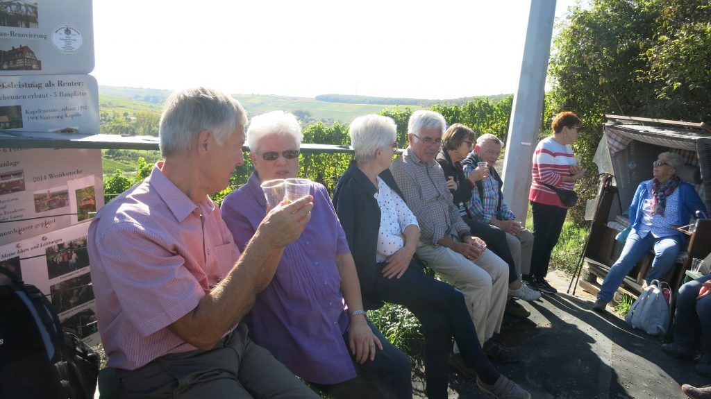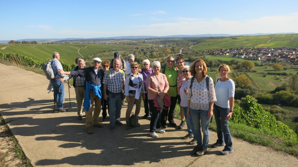 Bei fast sommerlichen Temperaturen fuhren am Samstag, den 12. Oktober achtzehn Wein- und Wanderbegeisterte mit dem Regionalexpress von Siegelsdorf nach Kitzingen. Mit von der Partie waren unser Bürgermeister Herbert Jäger und unsere Bürgermeisterkandidatin Ulla Schwarte. Vor dem Bahnhof in Kitzingen wartete ein Bus vom Mainschleifen-Express, der uns ins Winzerstädtchen Nordheim brachte. Was für ein Luxus: wir hatten den Bus für uns alleine! Nach einem kurzen Spaziergang durch das Städtchen setzten wir mit der Mainfähre (eine ganz seltene Konstruktion, da sie an zwei Stahlhochseilen geführt wird) über nach Escherndorf.