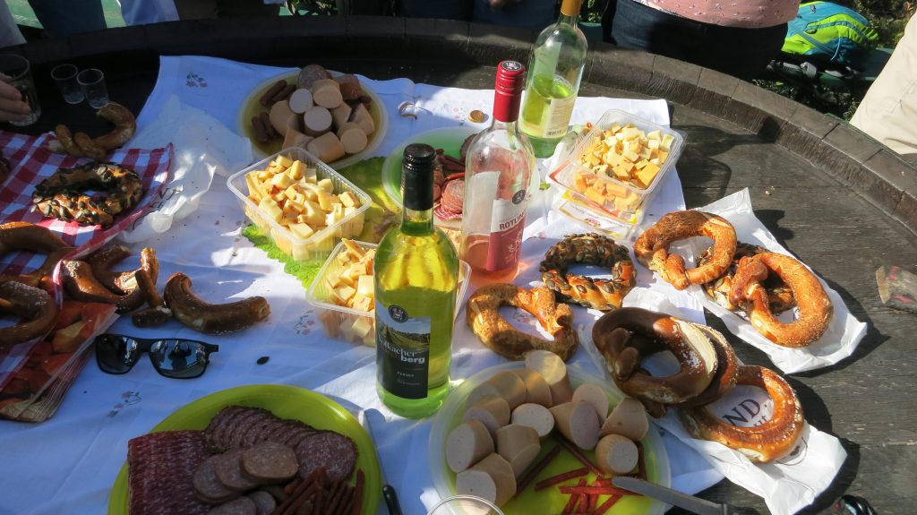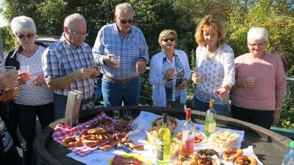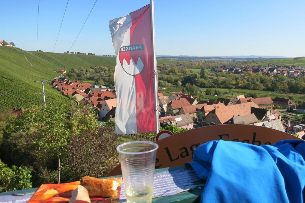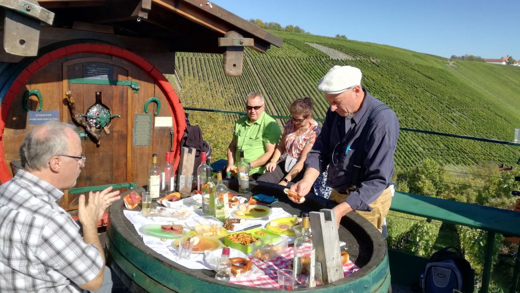 Wir ließen uns wie Goethe anno 1798 den süffigen Silvaner, Kerner und Rotling mit Brezen, Stadtwurst, Salami und Käse schmecken und schwärmten dabei von dem einmaligen Ausblick über die herbstlichen Weinberge und den Main. Ein großes, liebevoll eingerichtetes Weinfass rundete die romantische Deko ab.