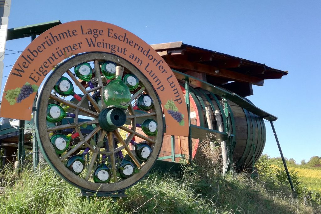 In der örtlichen Vinothek kauften wir einige Flaschen Escherndorfer Weines und machten uns dann auf zur Lourdes-Kapelle an der Escherndorfer Steige mit ihrer Mariengrotte und dem berühmten Glockenspiel. Ausgerechnet an diesem Tag fiel es aus; vielleicht weil die Uhr immer fünf vor zwölf zeigte. Auf einem kurzen, aber steilen Fußpfad erreichten wir unser erstes Tagesziel: eine tolle Aussichtsplattform mitten im Escherndorfer Lump. Die Aussicht war phänomenal und entschädigte für den steilen Aufstieg.