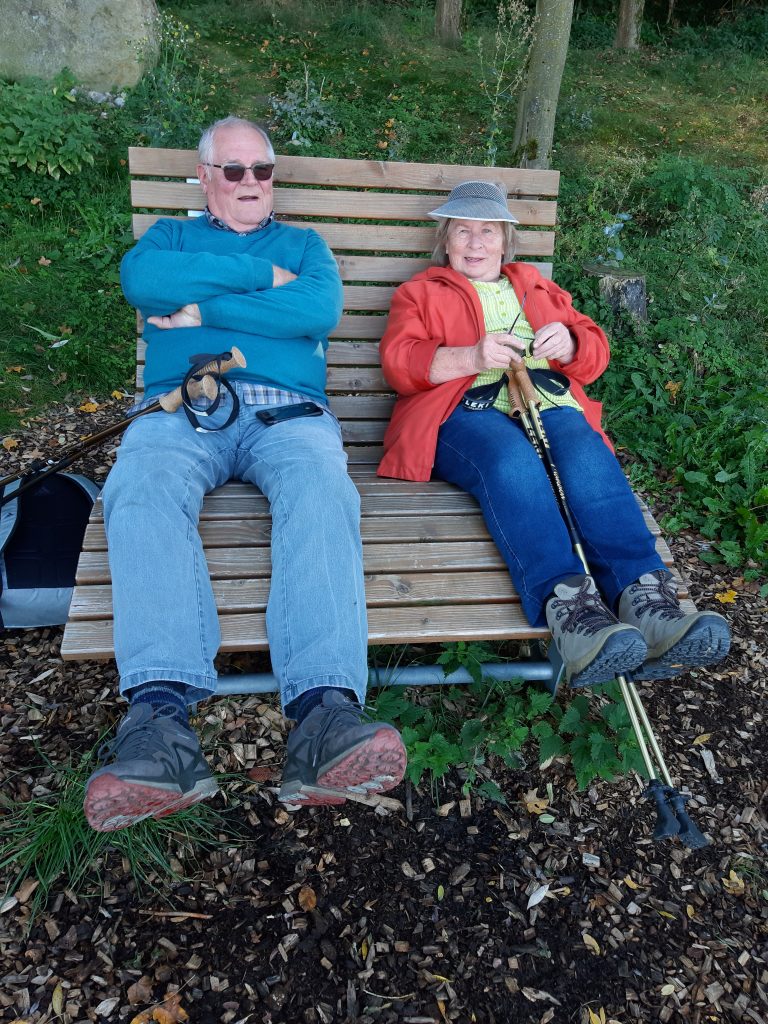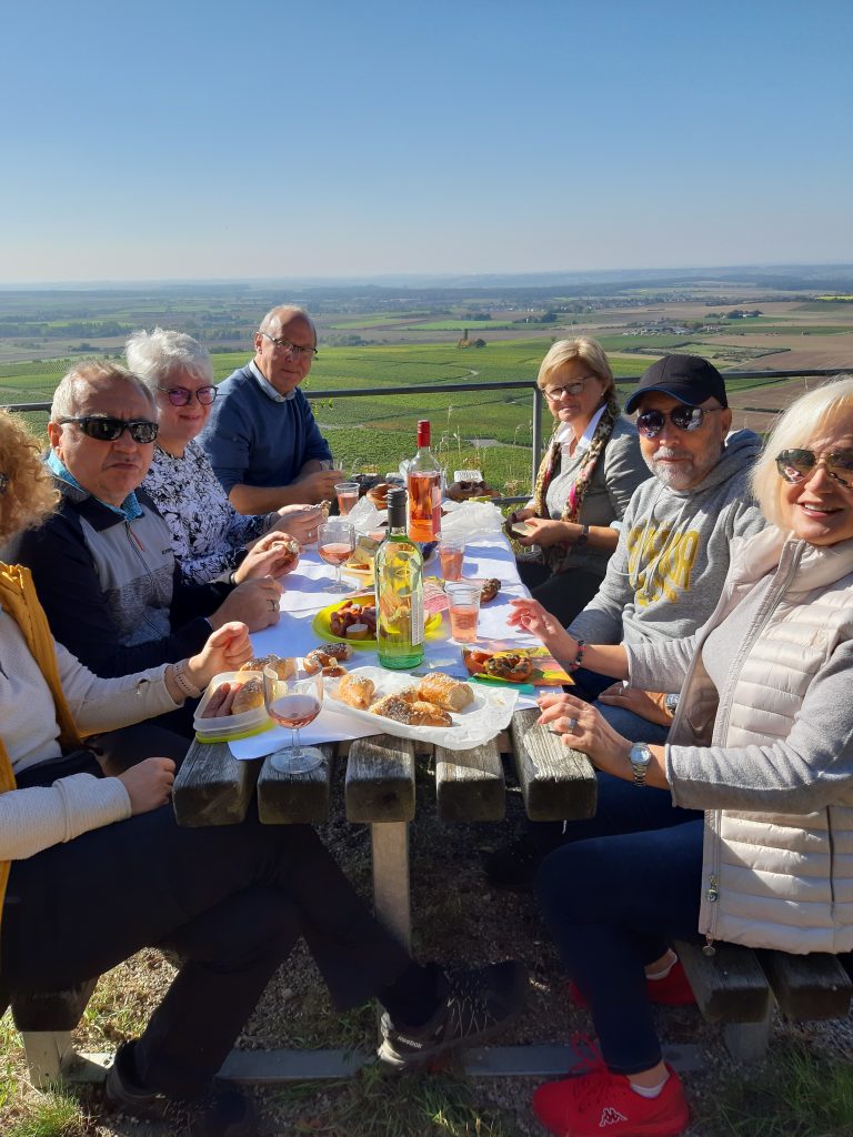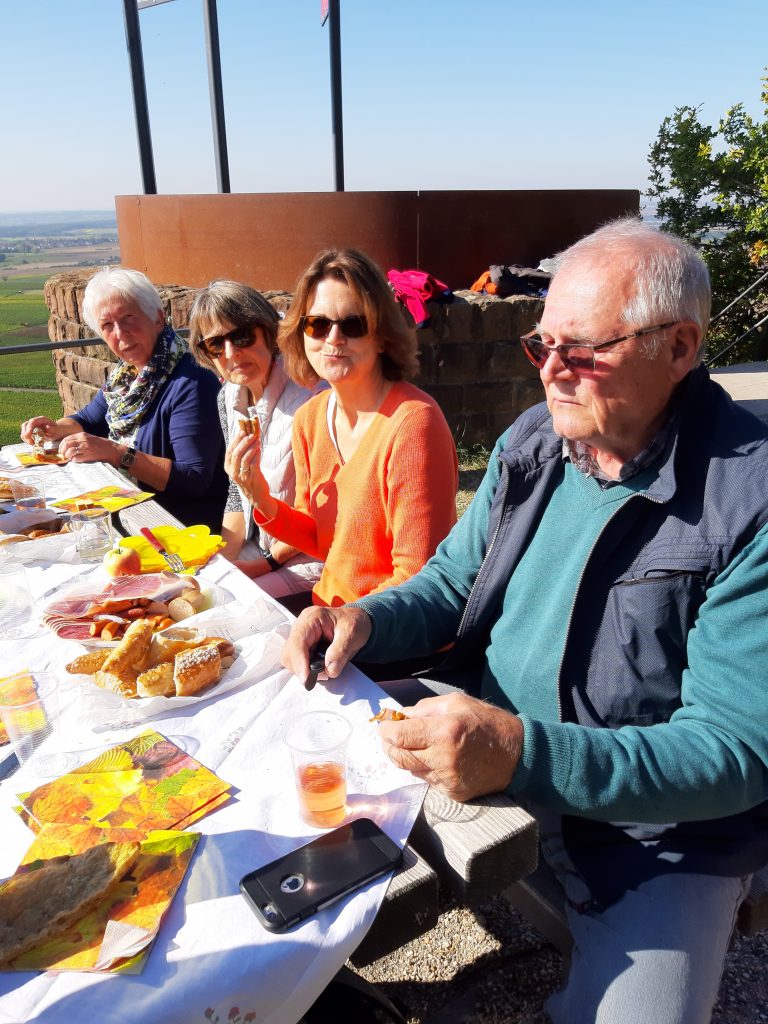 Durch das Rödelseer Tor verließen wir Iphofen und wanderten bergauf durch die Weinberge. Für unsere zwei „Kniegeschädigten“ kam die Rettung in Form eines freundlichen Winzers, der die beiden mit seinem Auto zu unserem 1. Etappenziel, dem „terroir f Iphofen“ fuhr. Das kleine „f“ steht übrigens für Franken. Nach einem längeren Anstieg erreichten auch die übrigen Wanderer den Picknickplatz.
