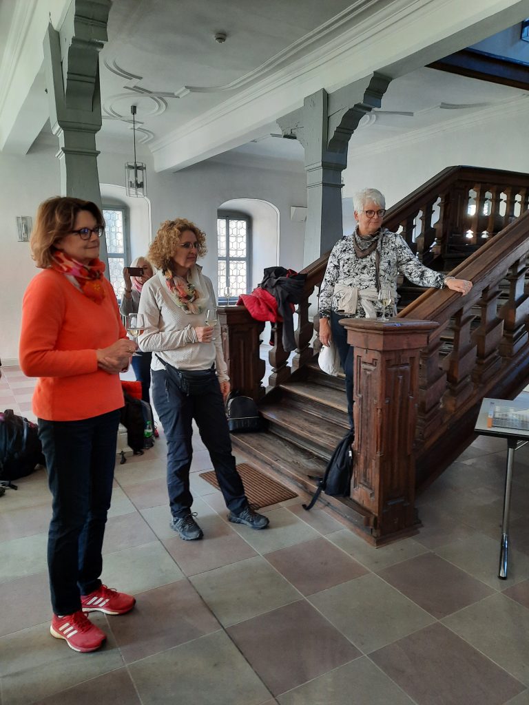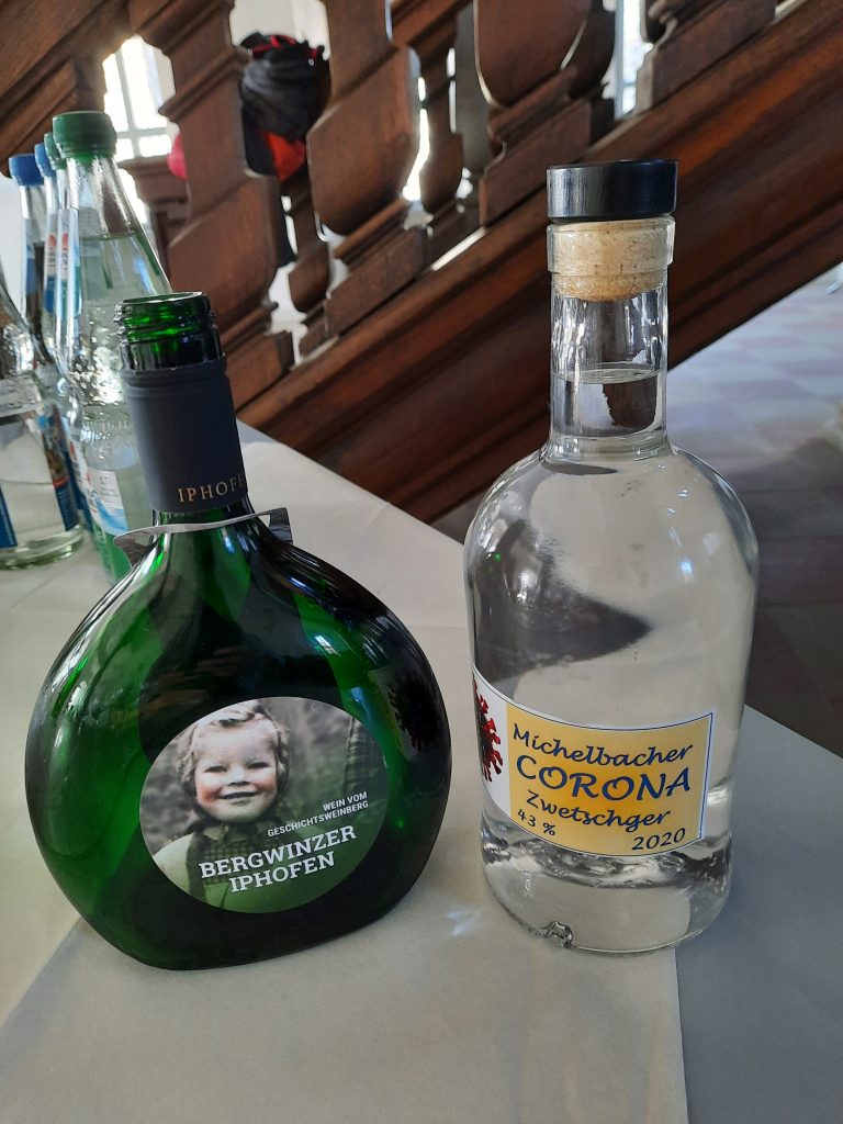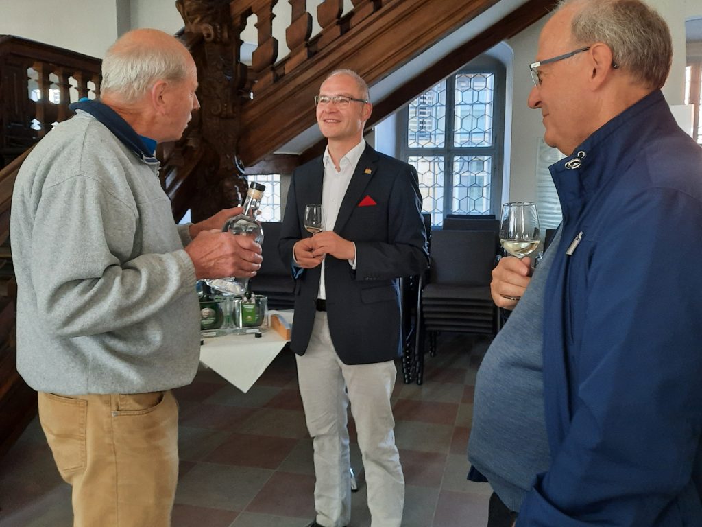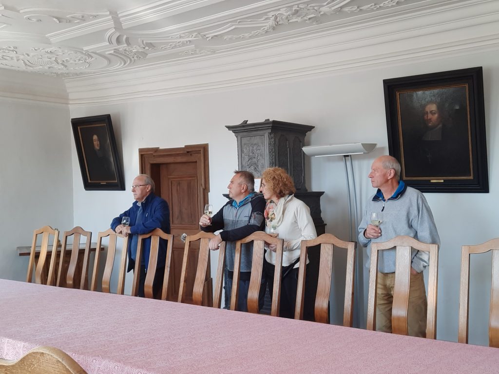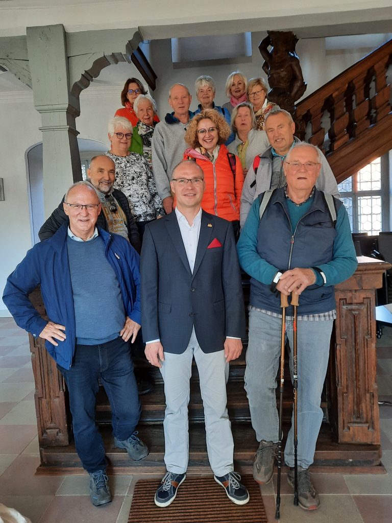 Wir waren sehr beeindruckt von der Verkündhalle mit ihren mächtigen Säulen und der alten, seit Jahrhunderten ausgetretenen Holztreppe. Beeindruckend war auch der historische Sitzungssaal mit seiner imponierenden Stuckdecke, alten Gemälden von früheren Herrschern und den bleiverglasten Fenstern, von denen aus man den gesamten Marktplatz überblicken konnte. Als Dank für den tollen Empfang überreichte Roland Leistner mit launigen Worten dem sehr sympathischen Bürgermeister Lenzer eine Flasche selbstgebrannten „Michelbacher Corona Zwetschger“ aus dem Coronajahrgang 2020. „G`sund bleiben!“ war unser aller Wunsch.