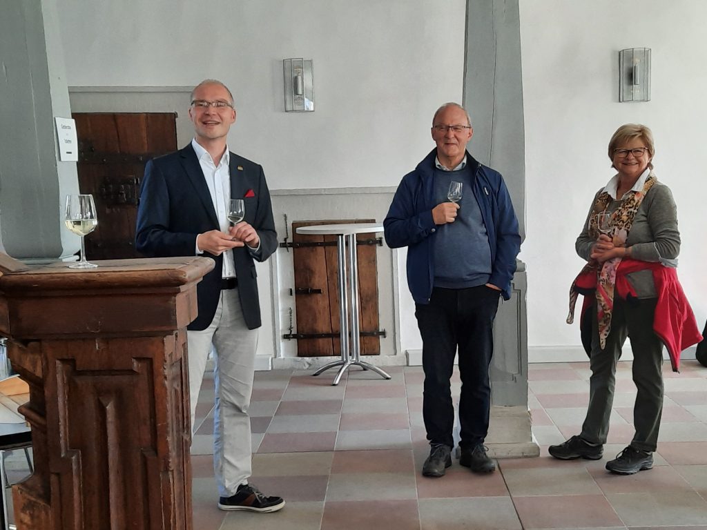 Dort wurden wir von Bürgermeister Dieter Lenzer (Freie Wählergemeinschaft Iphofen) sehr herzlich im historischen, barocken Rathaus der Stadt begrüßt. Bei einem kleinen Empfang schenkte er eine heute seltene Weinrarität vom Geschichtsweinberg aus: Der Wein wird wie seit dem Mittelalter im „gemischten Satz“, d.h. verschiedene Rebsorten nebeneinander, angebaut und zusammen gekeltert. Ein wirklich edles und seltenes Tröpfchen.
