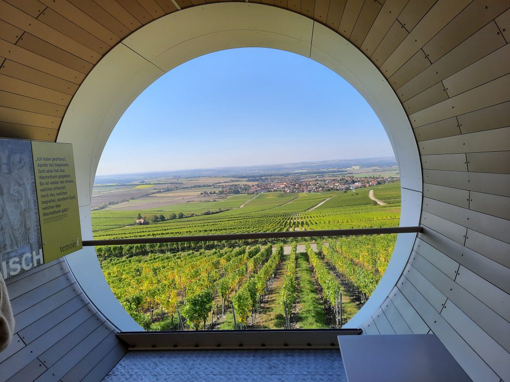 Von dort, unmittelbar über der Weinlage „Julius-Echter-Berg“, genossen wir den magischen Blick über die Weinberge. Dazu gab es eine zünftige Winzerbrotzeit mit verschiedenen Käsespezialitäten, Birnen, einem Ring fränkischer Stadtwurst, Schinken, Salami, Brezen, Salzstangen, original Schüttelbrot aus Südtirol und beste süffige Weine aus Iphofen. Bei einem kurzen Abstecher zum „terroir f Rödelsee“ mit der„Rödelseer Röhre“, bot uns der Fernrohr-Blick ganz neue Ein- und Ausblicke über die Weinberge.