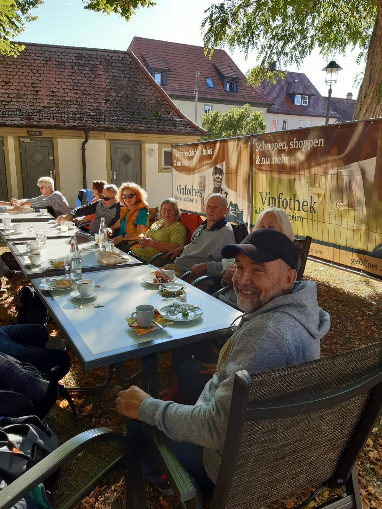 Durch die Lage „Rödelseer Küchenmeister“ ging es dann bergab in das alte Weindorf Rödelsee. Nach einem Spaziergang in dem malerischen Örtchen stärkten wir uns in der neu eröffneten „Vinfothek Schloss Crailsheim“. Im halbschattigen Schlossgarten unter einer riesigen Linde entspannten wir bei Kaffee und Kuchen, Traubensaftschorle oder einem fränkischen Schoppen.