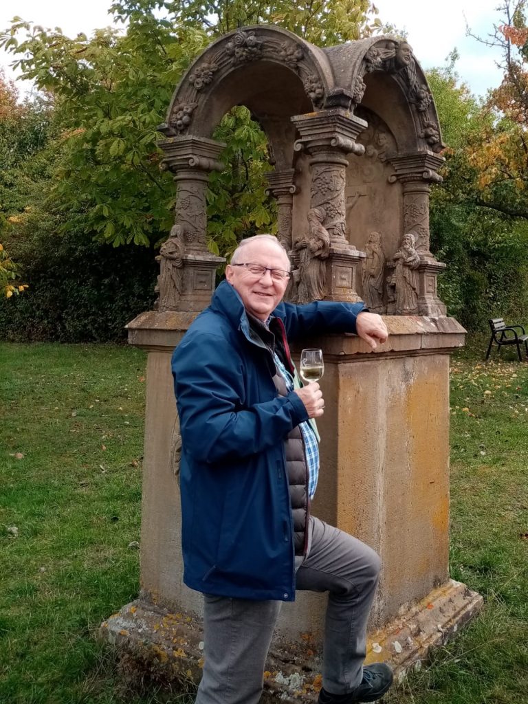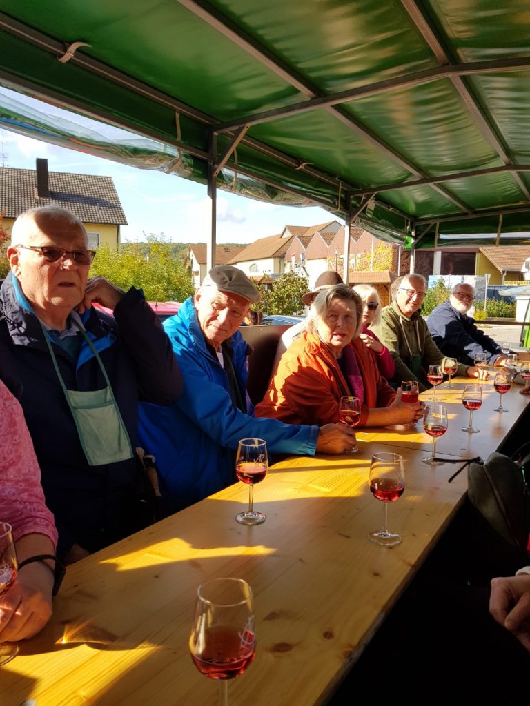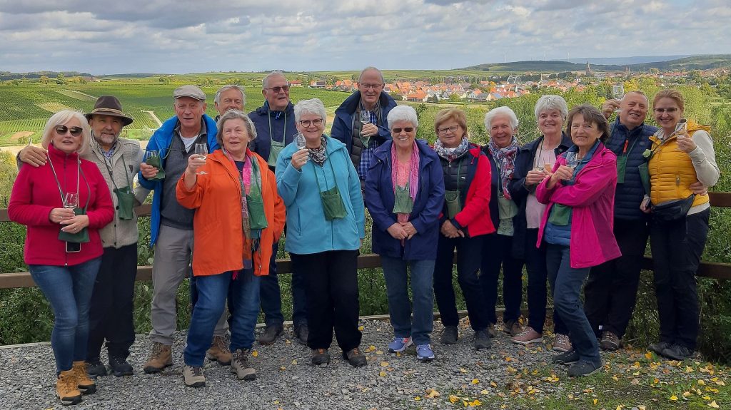Mit dem Regionalexpress fuhren fünfzehn gutgelaunte Weinwanderer bei sonnigem Wetter von Siegelsdorf nach Kitzingen und weiter mit dem Mainschleifen-Express nach Nordheim. Dort erwartete uns Winzer Ernst Borst mit seinem Schoppenexpress.  Er nahm uns mit in den Wingert und  zu den schönsten Aussichtspunkten auf der Weininsel zwischen Nordheim und Sommerach. Unterwegs stellte uns Herr Borst an sechs Stationen sechs verschiedene Weine vor, ließ sie uns verkosten, philosophierte über die wunderbaren Aromenund veranschaulichte uns anhand der unterschiedlich geformten Weinblätter die verschiedenen Rebsorten. Dazu ließen wir uns, wie gewohnt, Brezen, Wurst und Käse schmecken, genossen den herrlichen Blick über die Weinberge und lauschten den Ausführungen, Geschichten und Informationen unseres Gastgebers. Bei der zum Teil rasanten Fahrt über holprige Wege musste jeder sein Glas richtig  festhalten; trotzdem verspritzte so mancher guter Tropfen. Auf der Aussichtsplattform Kreuzberg angekommen, hatten wir bei einer exzellenten Spätlese unseres Winzers einen traumhaften 360°-Rundumblick über die Weininsel. Dazu stimmten wir – wie es bei uns an diesem magischen Ort schon lange Tradition ist – das Frankenlied an.