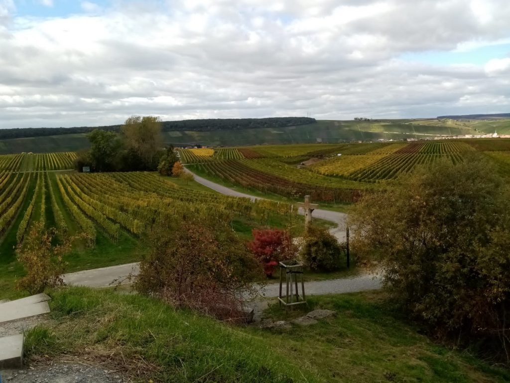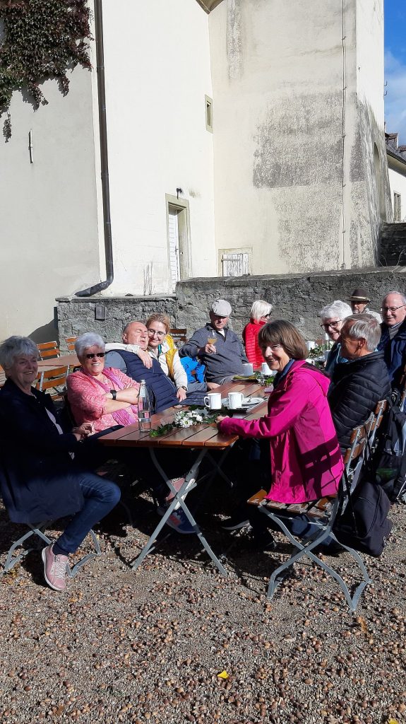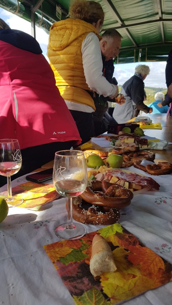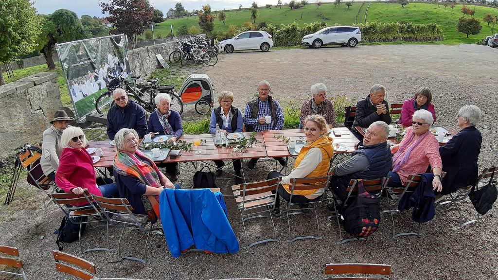Dort gab es im Garten der Vinothek vom Weingut des Grafen Schönborn Kaffee, Kuchen und Federweißen. Der Blick über die Schönborn`schen Weinberge und Wiesen bis hin zum ehrwürdigen Weingut des Grafen war fantastisch.