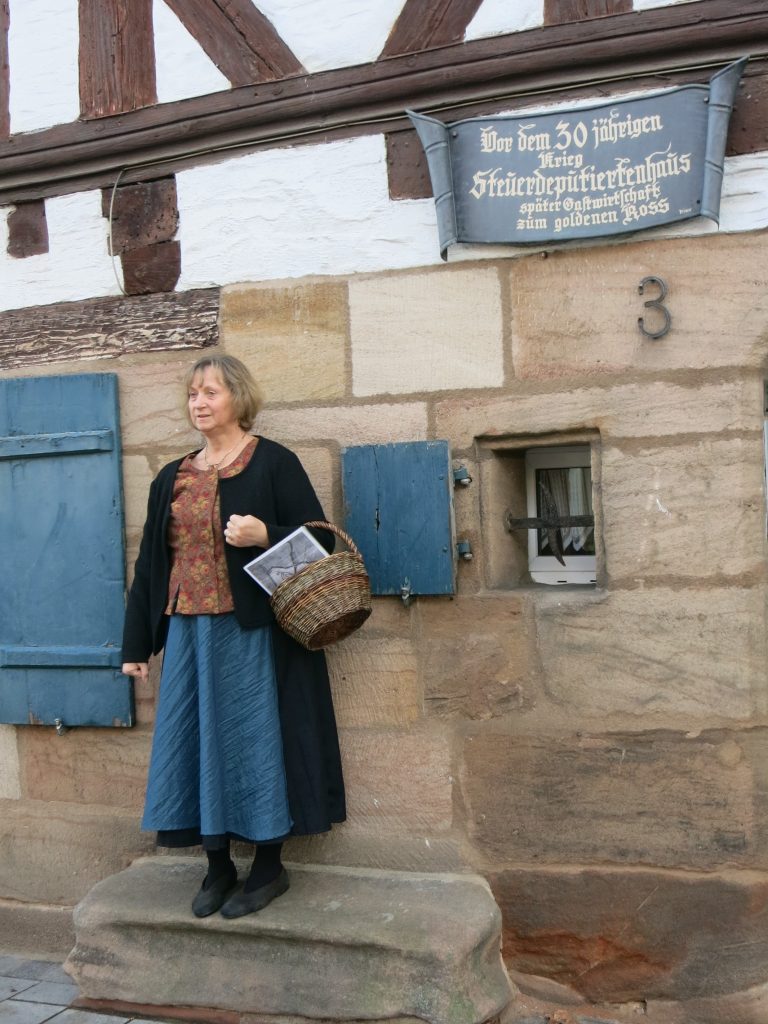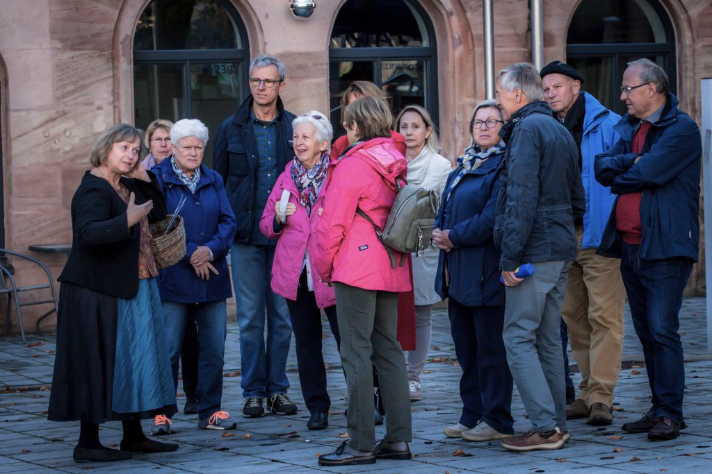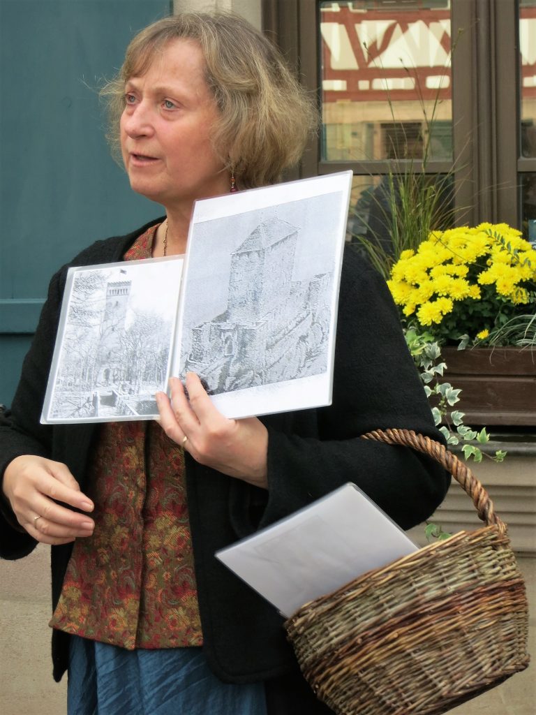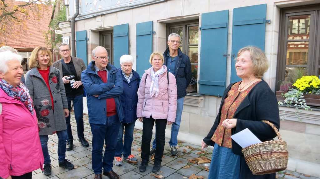 Bei schönstem Herbstwetter erklärte Elke Eder die fast tausendjährige Geschichte Zirndorfs. Sie erzählte in unterhaltsamen, spannenden Geschichten und Anekdoten vom Bau der Alten Veste im 13. Jahrhundert durch die sich ewig streitenden Gebrüder von Berg, vom Leben im Mittelalter, von den Wirren des 30-jährigen Krieges, bis hin zur Entwicklung Zirndorfs zu einem Zentrum der Spielzeugindustrie und Bierbraukunst.