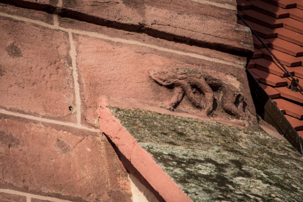 - Welche seltsamen Figuren sieht man an der Fassade des Kirchturmes der Kirche St. Rochus?